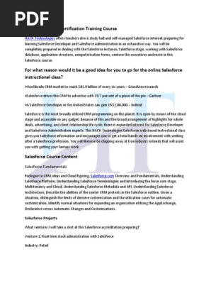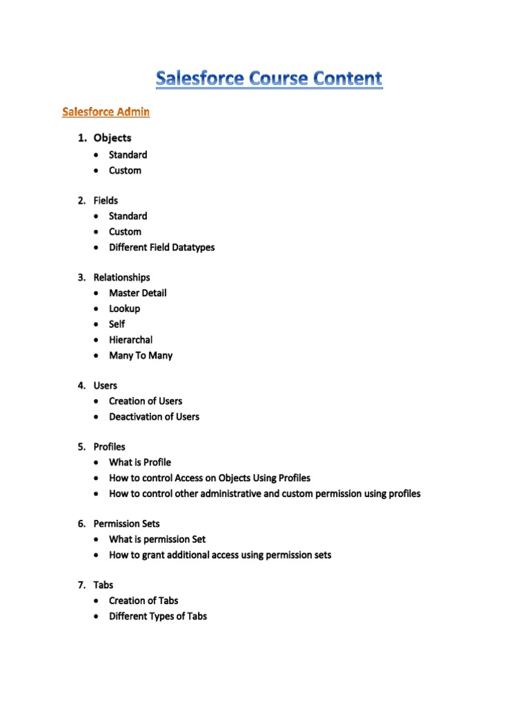 Salesforce Admin Training Content 1. View Salesforce Course Content_Lightningpdf from DECASTROPJ 23243 at University of Texas. Trainers are highly skilled and qualified at the same time the course content is quite comprehensive.